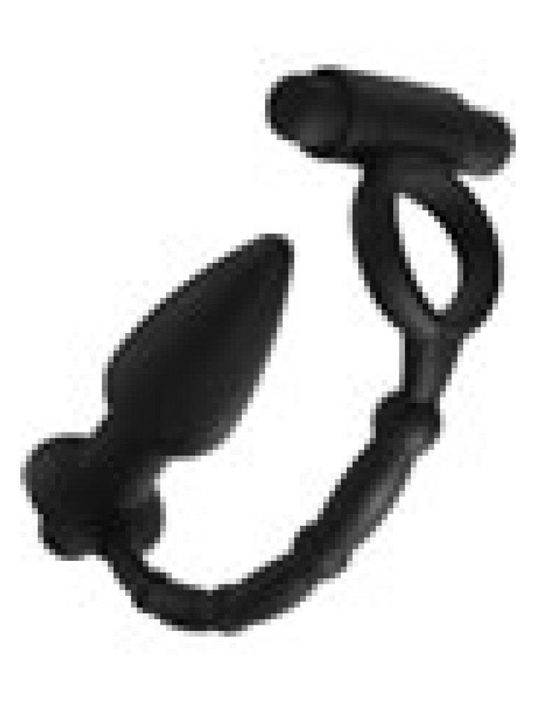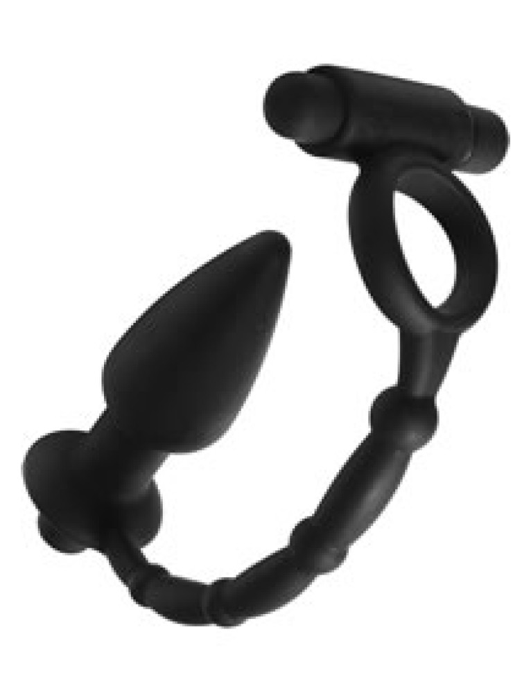 Tease them with double the pleasure...This dual stimulation cock ring and anal plug combo comes to you with devious pleasure for his cock and his ass. Enhance his erection with a vibration ring that connects to a delicious vibrating butt plug, allowing you to tease his most sensitive areas with waves of sensory pleasure. Made entirely of premium silicone, and powered by two independent vibrating bullets. Take it in the shower, this darkly sexy toy is splash proof!Measurements: Cock ring 1.25 inches in diameter unstretched.Anal plug: 5 inches in total length, 4 able, 1.45 inches in diameter at widest point. Material:andnbsp;Silicone, ABS PlasticColor:andnbsp;BlackNote:andnbsp;Requires (2) AAA batteries, not included.