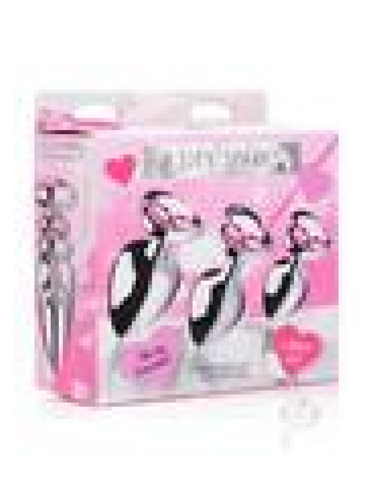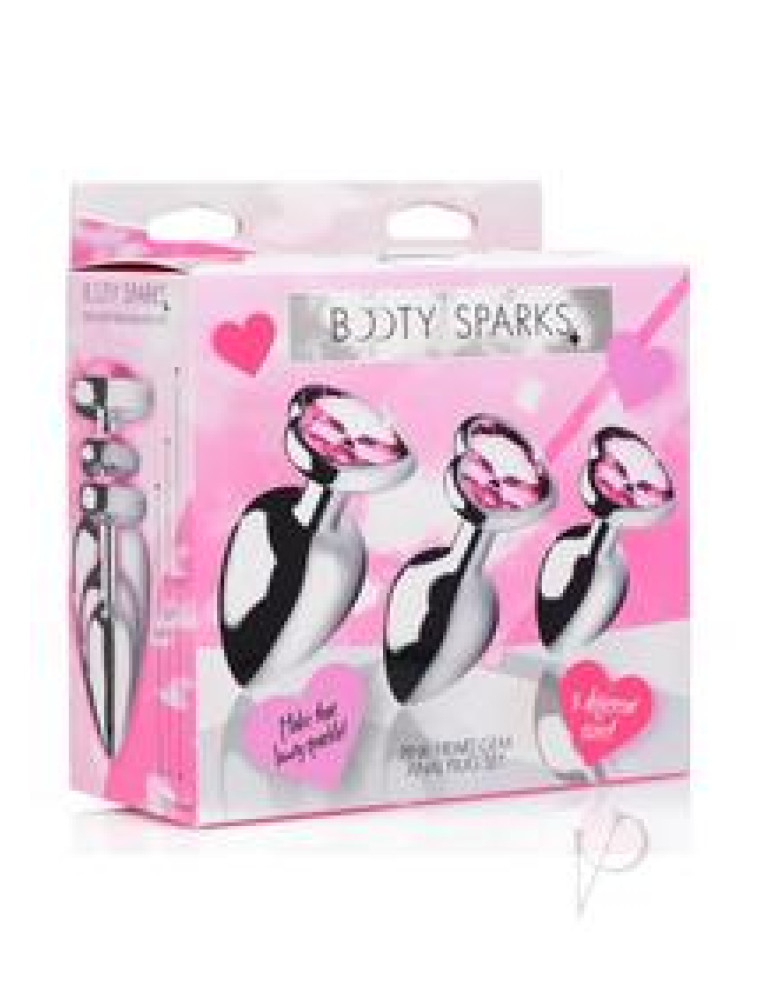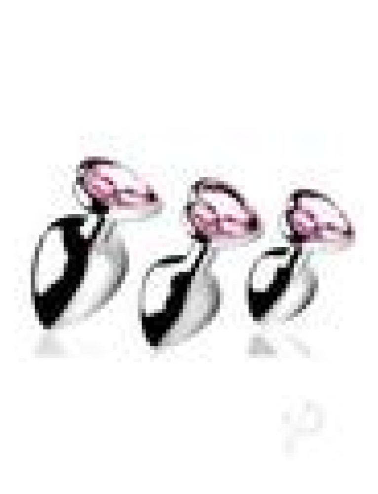 When love is in the air, adorn your derriere! These heart-shaped plugs are simultaneously sweet and sexy. Three different plug sizes allow you to take anal play at your own pace, or choose based on what you are in the mood for! Pop in each sleek plug to appreciate the comfortable weight inside your body, thanks to the nickel-free aluminum alloy material. Great for temperature play, you can warm or cool them in water before ion. The sparkling charm at the base will be a romantic and exciting surprise for your partner when you bend over. Use with any lubricant of your choosing and clean after use with mild soap or toy cleaner.Measurements: Small plug is 2.6 inches in total length, 2.4 inches able length, 1 inch at widest diameter, .4 inches in diameter at stem. (Circumference 3.14)Medium plug is 3.2 inches in total length, 3 inches able length, 1.3 inches at widest diameter, .45 inches in diameter at stem. (Circumference 4.084)Large plug is 3.8 inches in total length, 3.4 inches able length, 1.6 inches at widest diameter, .48 inches in diameter at stem. (Circumference 5.026) Material:Â Aluminum Alloy, ABS PlasticColor:Â PinkNote:Â Includes 3 plugs