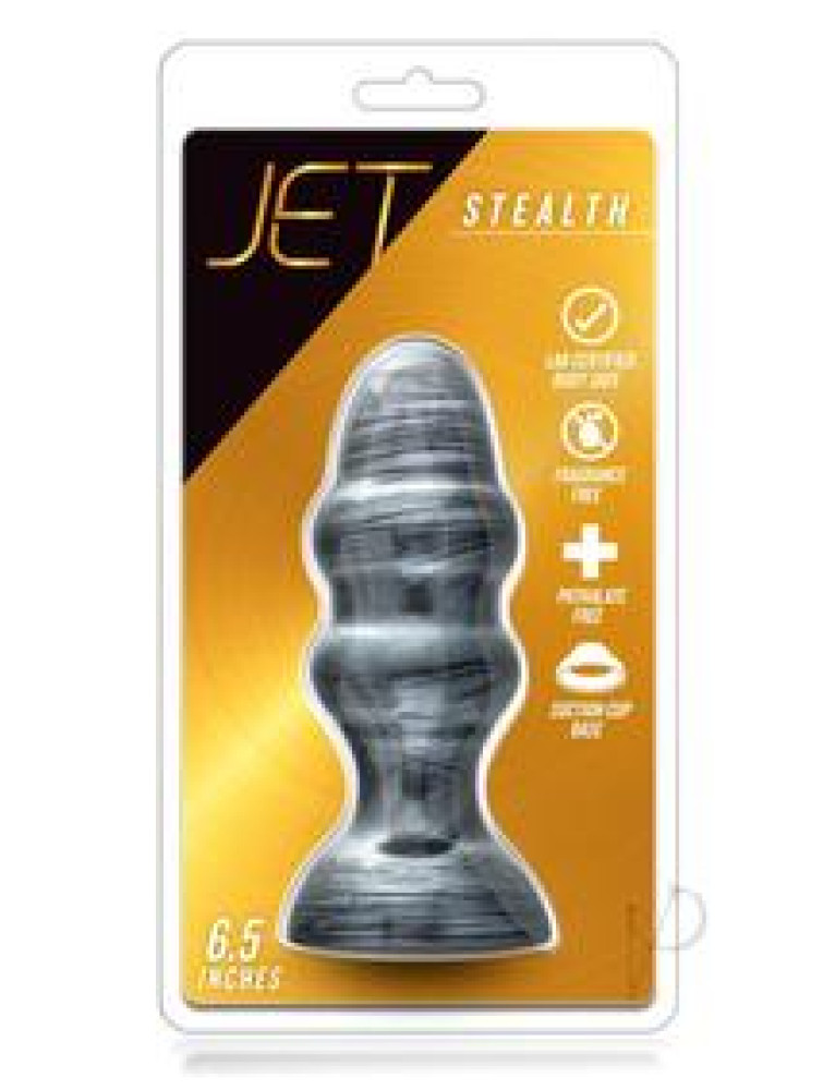 Jet`s latest and greatest. The Stealth is a Pro sized butt plug that looks sleek and menacing with a Jet Black Carbon Metallic Finish is made from lab tested body safe non porous PVC. Play Hard. Play Safe. This anal plug is for the advanced user. Soft, flexible and it`s tapered shape allows for easy and comfortable ion. The sturdy suction cup base sticks on any smooth flat surface and prevents overion. Wash with soap and water before and after each use. Pat dry with a clean dry cloth.